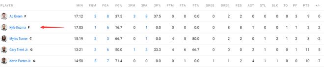 作为球队的先发大前锋,全场比赛17分钟,6中1,三分1中0,拿到2分8篮板1助攻1失误,命中率16.7%。最离谱的是在篮下出手了4次只命中一球,上篮都上出了一个过桥!库兹马这个状态真是令人无奈。